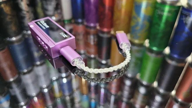 附送配件一条双Type-C的数据线,采用高纯度四芯铜镀银材质,尤其两端插头金属哑光紫色与机身呼应,搭配银色线身,颜值相当可以。本体没有屏幕,码率全靠指示灯颜色分辨,除了Type-C插孔,还有3.5mm和4.4mm插孔各一,音量加减以及暂停播放的三个常见控制按键,最后就是一个可以拨动的圆钮,以物理切换增益高低,这个我觉得很方便,挺好。